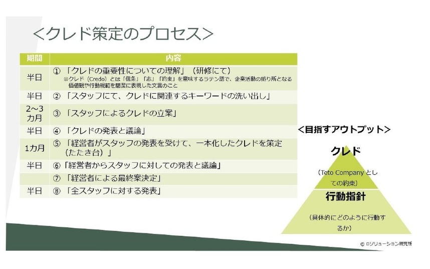 Teto Companyでは、クレド(「信条」「志」「約束」を意味するラテン語で、企業活動の拠り所となる価値観や行動規範を簡潔に表現した文言)はすでにありました。ただ、徐々にTetoのスタッフも増えてくる中で、「改めてスタッフと共にクレドを再策定したい」と奥ちゃんと私とで考えて、ワークショップをスタートしました。