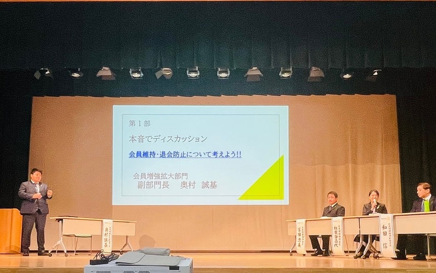 膳所ガバナーのお膝元である大分県日田市で行われた「会員増強・ロータリー財団合同セミナー」では、当クラブの紅葉谷会員(写真:右から2人目)が登壇し、他クラブのロータリー会員たちとのトークセッションを行いました。終始Eクラブの魅力について語ってくれて見ている私もとても嬉しくなりました。