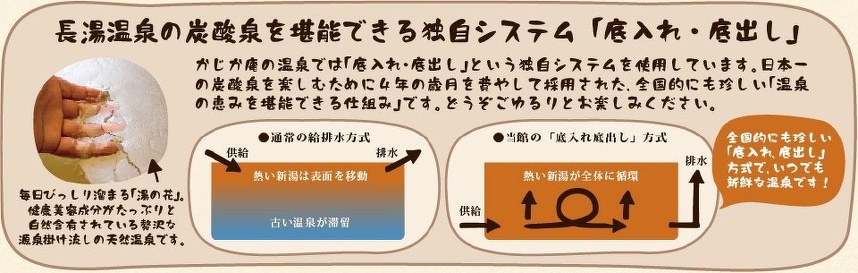 弊社は竹田市直入町にて旅館業を営んでおります。炭酸泉で有名な長湯温泉ですが、うちの温泉は炭酸成分がお湯に溶け込んでいるため、肌に気泡はつきません。