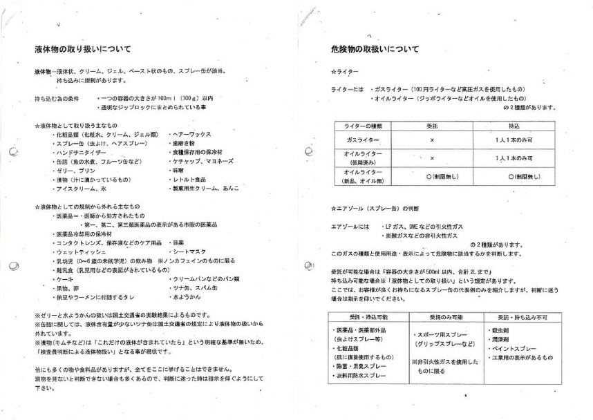 液体物の機内持ち込みは100ml以下の物合計1リットルまで。