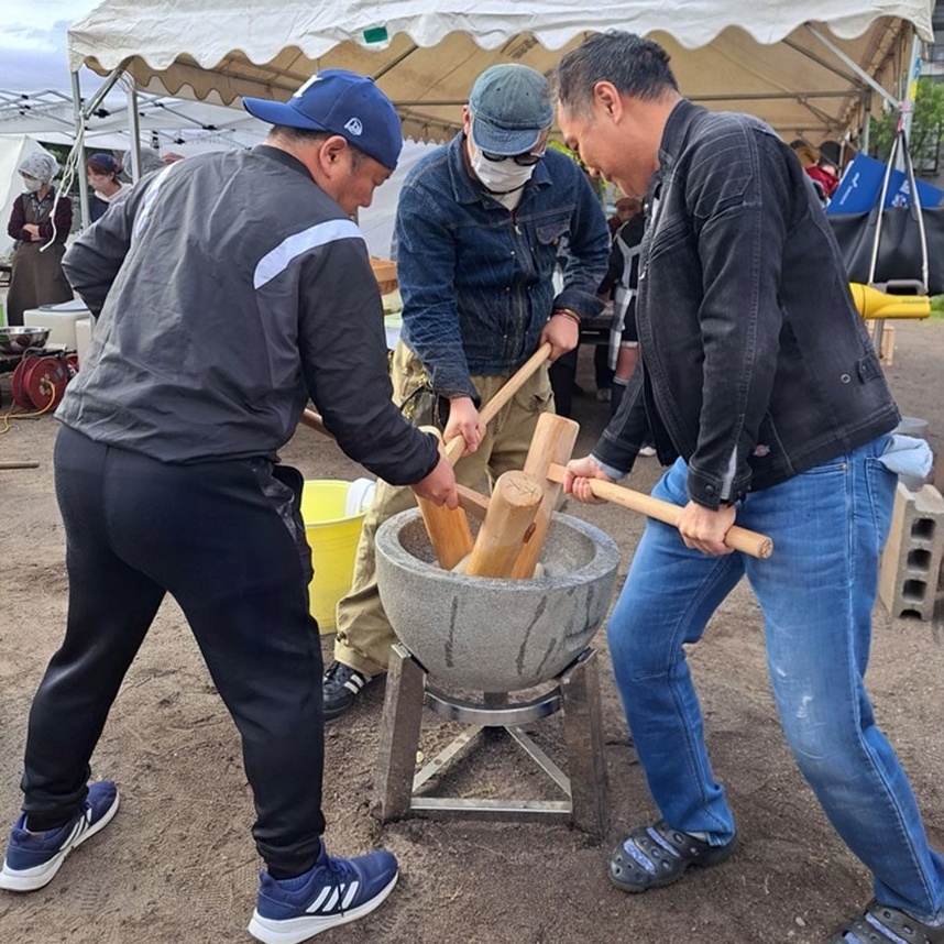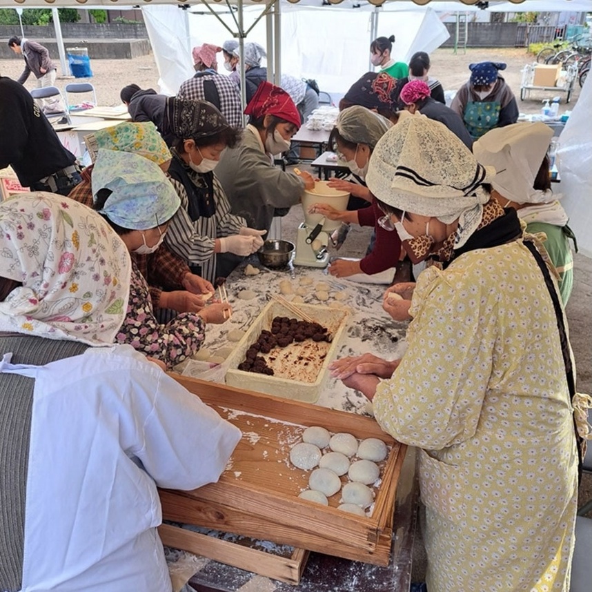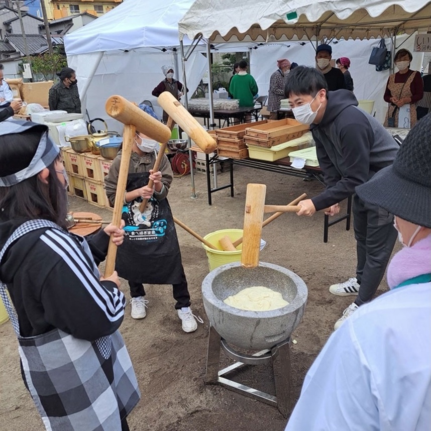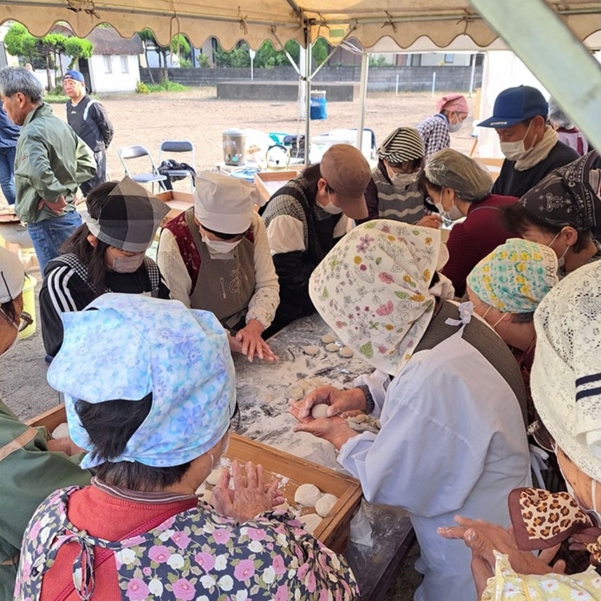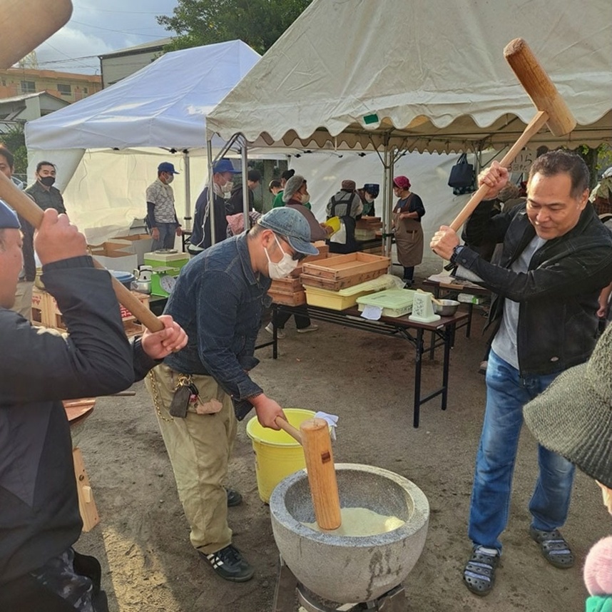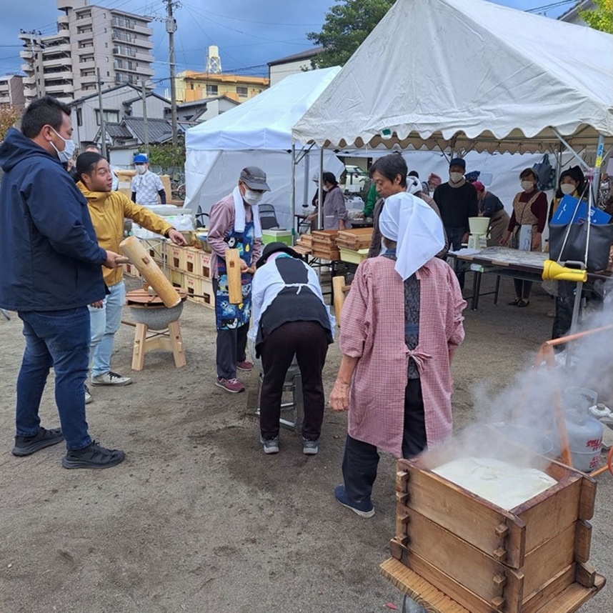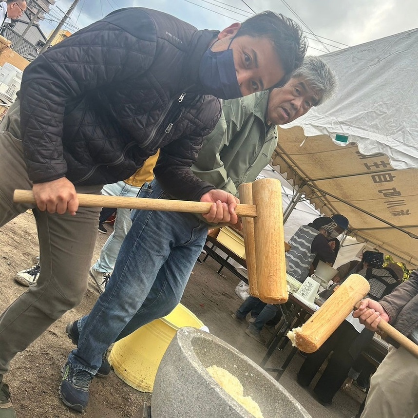 「餅つき」はコロナ禍では中止していたようで、地域の皆さんも久しぶりの餅つきを楽しんでいました。初めて杵を持つ若者に先輩方が「手が逆だ!」と教え、餅をひっくり返すタイミングや水分の確認を年配の女性が「そうじゃない!こうするんや!」と教え、餅の成形もベテランの方を中心にどんどん進んでいき、とても活気と笑いのある雰囲気を久しぶりに楽しみました。
