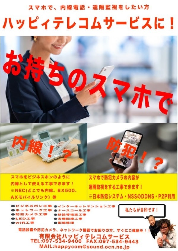 自社の紹介をさせていただくと、大分市の豊町に事務所があり、営業品目はビジネスホンと呼ばれるボタンがたくさんある電話機や、防犯カメラ、wifi等のネットワーク機器の取り付け、それに伴う配線工事を行っています。