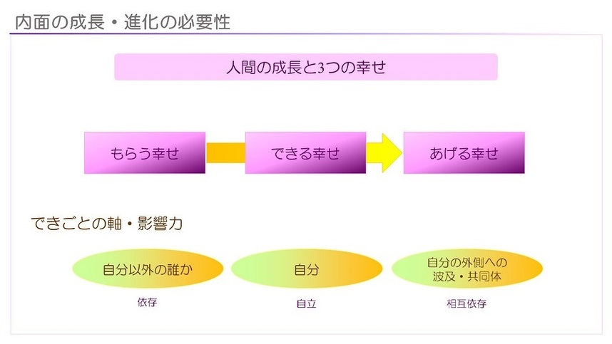 人間の内面の成長・進化を理解する指標として,わたくしは,「3つの幸せ」というフレームを活用しながら学生によく説明します。3つの幸せとは,人が「もらう幸せ」「できる幸せ」「あげる幸せ」のどこに幸福感を得るのかという,内的成長との関連を示すものです。これは,スティーブン・R・コヴィー博士の著書「7つの習慣」にある,「依存」「自立」「相互依存」へと至る「成長の連続体」の概念と通じるところがあるとわたくしは考えています。