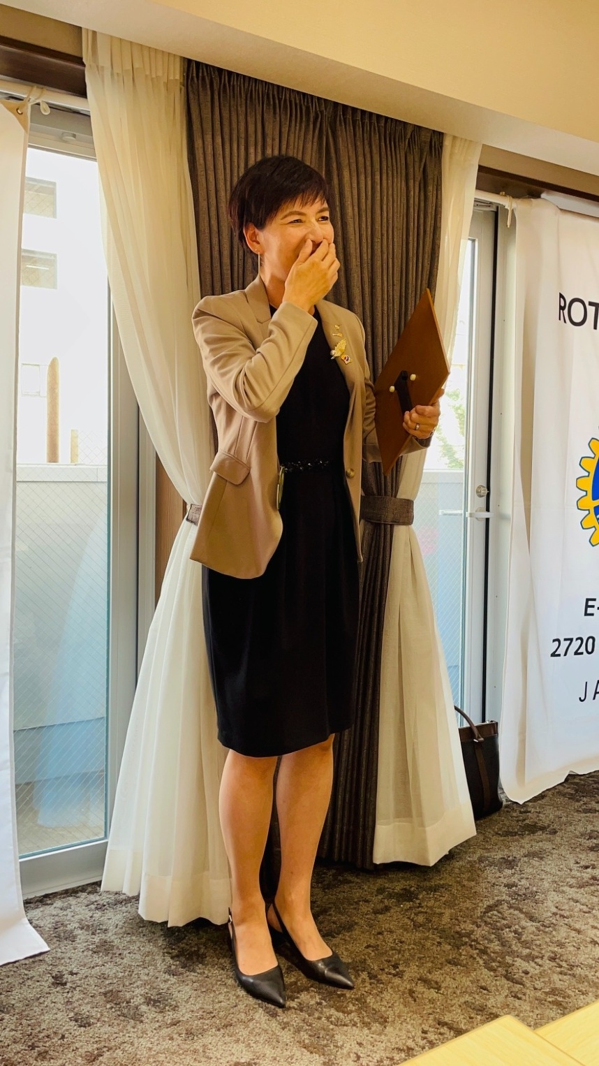 2720 Japan O.K.ロータリーEクラブ 2023-2024年度の幹事をさせていただきました神鳥絵里です。本日は陶山年度最後の例会ということで、わたしが卓話を担当させていただきます。
