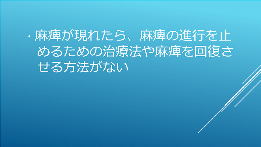 ここで一つ大事なポイントがあります。一度ポリオウイルスに神経が侵されて麻痺が現れたら、この麻痺の進行を止めたり、麻痺を回復させたりする方法は、いまだにない、ということです。