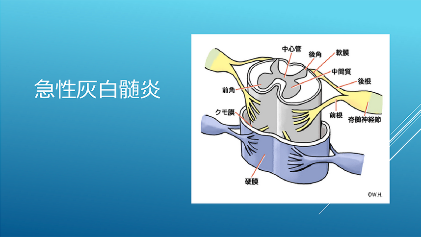 ポリオは、別名を急性灰白髄炎、あるいは、小児麻痺と言います。ポリオウイルスというウイルスが感染することによって、様々な症状、特に、急性の麻痺が起こる病気です。
