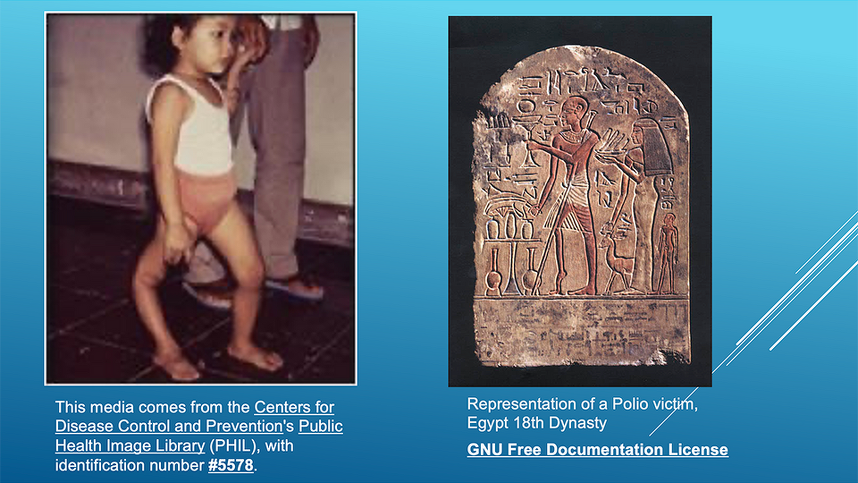 右の写真は、古代エジプトの石碑に描かれた人物ですが。ちょうど同じように足の麻痺を起こして杖を突いている人の絵が描かれています。これは紀元前1400年前後のものだそうです。また、縄文時代の人骨にもポリオに罹って足が麻痺した痕跡があるものが見つかっているそうですから、かなり古くからある病気です。