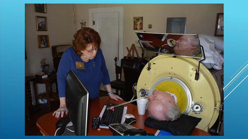 入ってから10年後くらいには、一日のうち、8時間までは、機械の外に出て車いすで過ごすことができるようになったそうです。テキサス大学に進学し、弁護士さんとして働いていたそうです。「鉄の肺」の頭の部分の横にパソコンのキーボードとタッチトーンの電話を置いており、口にくわえた棒で操作をしていました。遠くに出かけるときは、車輪付きの鉄の肺を目的地まで輸送していました。