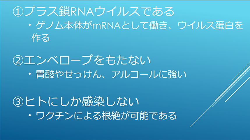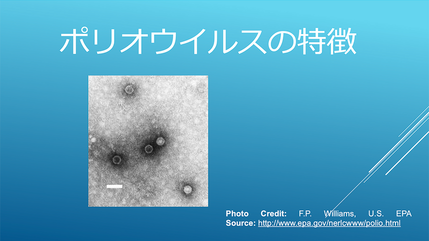 さて、ポリオという病気について、だいたい理解できたと思います。では、この、ポリオウイルスというのは、いったいどんなウイルスなのでしょうか?