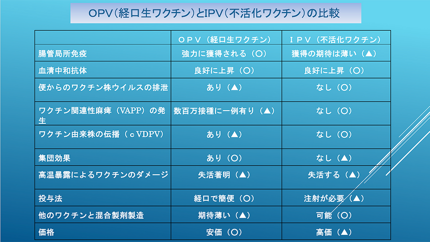 日本のように、現在ポリオが終息している地域では集団免疫の獲得は不要ですので、より安全な不活化ワクチンを投与するのが望ましいと思います。しかし、パキスタン、アフガニスタンのようなまだポリオが発生している地域では、より多くの人が確実に免疫を獲得する必要があります。そのためには、経口ワクチンの投与が望ましいと思われます。