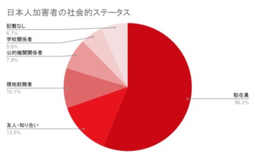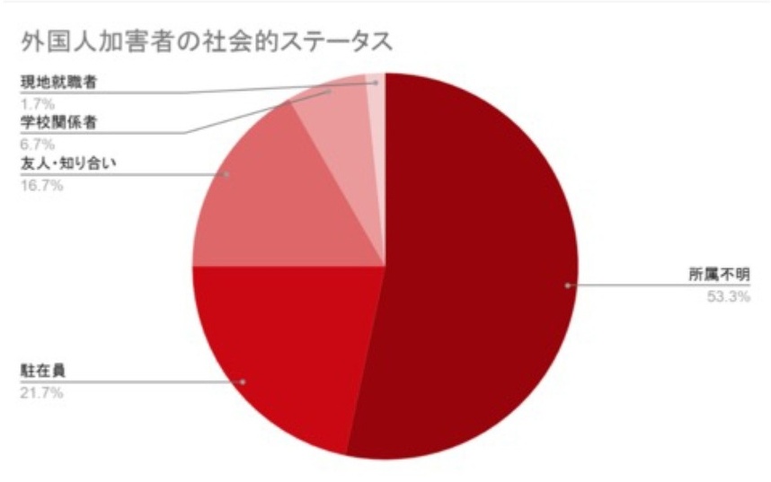 中でも私個人衝撃的であったのは、日本人コミュニティ内での事件が多く発生していることです。日本人が加害者であるケースの半数以上では、加害者は駐在員という報告があります。異国の地で同郷の人を見つけると、普段以上に安易に信用してしまう心理に漬け込んでいると言えるのではないでしょうか。そのほか、日本人以外の加害者であるケースでは、不明という回答が最も多い結果となっています。