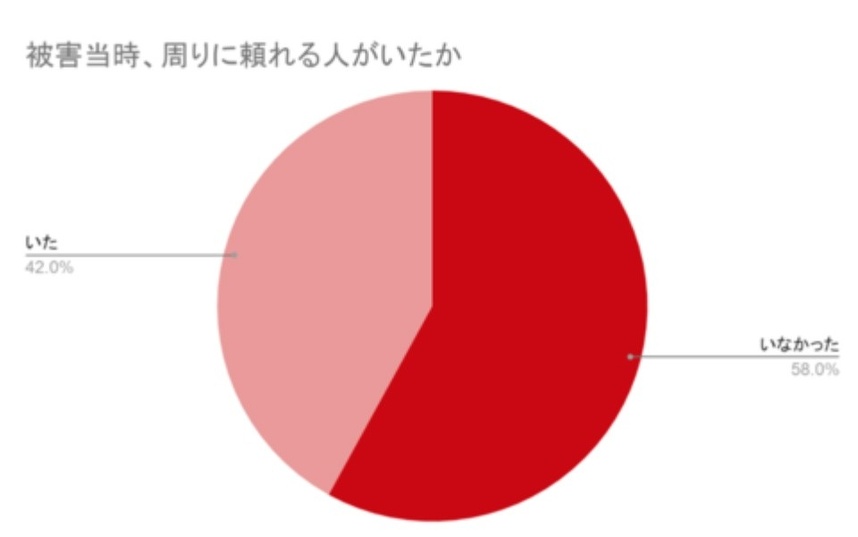 被害者の58%が現地に相談できる人、頼れる人がいなかったと答えており、留学先での閉ざされた環境、孤独感が浮き彫りになってきています。