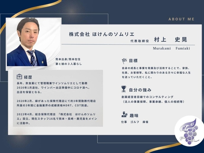 皆様、はじめまして。株式会社ほけんのソムリエ代表の村上史晃と申します。本日は、私がどのようにして「ワイン」から「保険」へ御縁が結び、人生に寄り添う「ソムリエ」としての道を歩んできたのか、お話しさせていただきます。