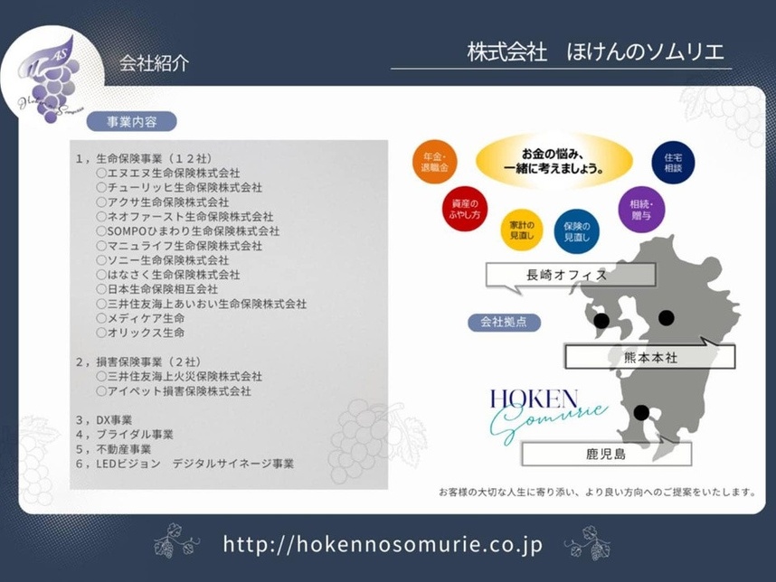 2023年4月に独立し、「ほけんのソムリエ」を設立しました。この社名には、ワインのソムリエのように、お客様一人ひとりに最適な保険商品を提供したいという思いが込められています。