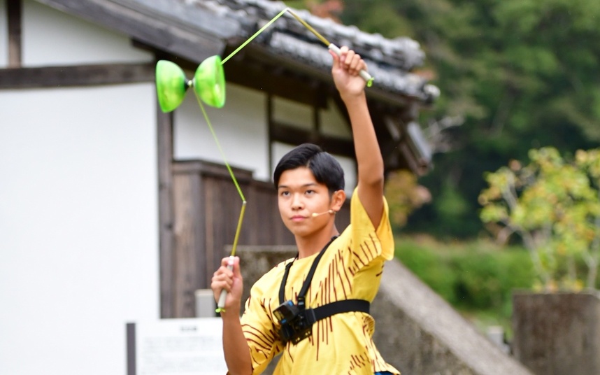 ショーの構成を作り、中3まで2年間、様々なイベントに出演させ経験を積み重ねました。また来県したパフォーマーのアテンドやワークショップなどの経験をしながら技を磨いてきました。そして昨年の大道芸フェスタで、ついにパフォーマーとしてデビューしました。2年前生徒だった子が世界で活躍しているパフォーマーと一緒にステージに立ち堂々と演技する姿を見て感涙しました。