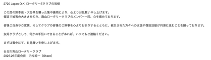 台北市南山ロータリークラブ会長 内片様より、先日の豪雨被害に関してお見舞いのご連絡をいただいております。