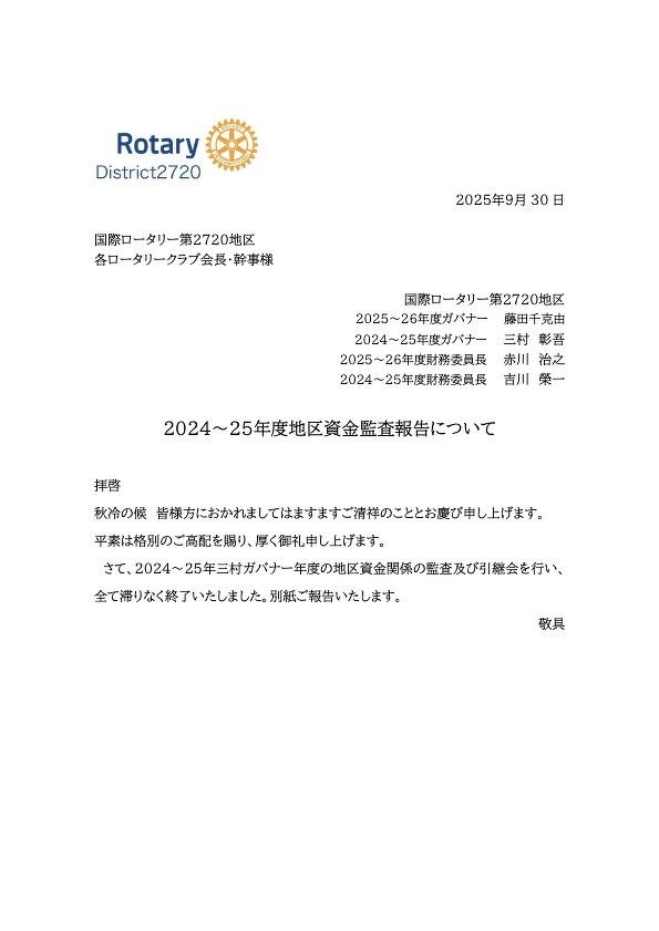 GOVERNOR ADDRESS:2025年9月29日合同公式訪問例会