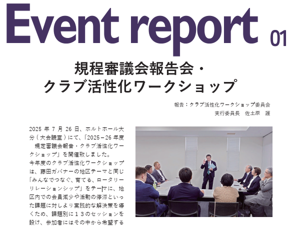 日本におけるロータリーの公式情報誌である『ロータリーの友』は各クラブが活動のヒントを得られるような実践事例の紹介や「エバンストン便り」による世界的な動きの紹介も掲載されています。今回は毎号「横組み」紙面と「縦組み」紙面とから構成される「ロータリーの友」の紙面につき「横組み紙面」から紹介させていただきました。