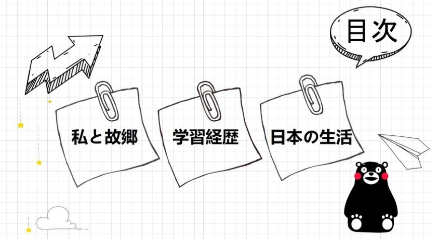 本日のテーマは「自己紹介」となっていますが、実は皆さんにぜひお話ししたいことがたくさんありますので、次の3つの部分に分けてお話しさせていただきます。