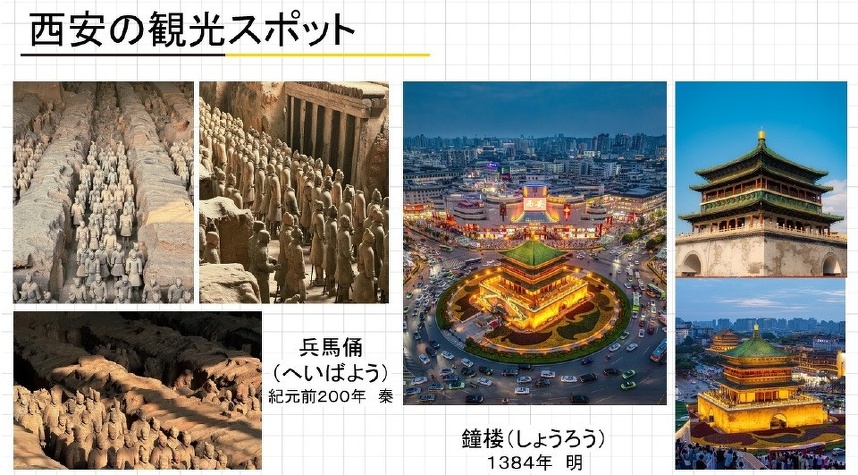 右の写真は、鐘楼という西安市の中心にある有名な歴史的な建物です。1384年、明の時代に建てられました。今から600年以上前の建物です。もともとは時間を知らせるために大きな鐘をならす場所として使われていました。今の鐘楼は、フランスの凱旋門みたいに交通量の多い道路で周りを囲かこまれています。西安のシンボルの一つで、夜になるとライトアップされて、とてもきれいです。