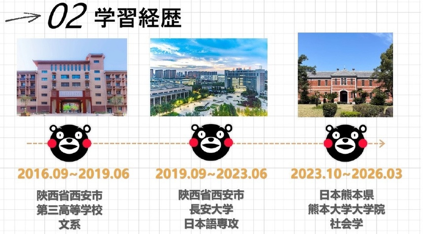 私は幼稚園から大学まで、ずっと西安で勉強してきました。高校の時は文系の学生で、その時英語が得意で、言語学に興味があります、それで、大学に進学する時、「もう一つの外国語を学びたい」と思って、大学では日本語専攻を選びました。