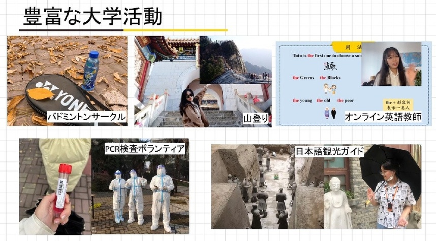 ボランティア活動にもたくさん参加しました。たとえば、コロナの時にはPCR検査のボランティアをしたり、観光地で日本語のガイドをしたりしました。もしみなさんが西安に遊びにいらっしゃることがあれば、私案内できます!