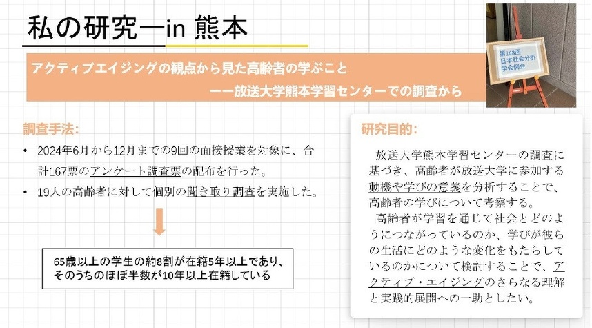 今私の卒論のテーマは「アクティブエイジングの観点から見た高齢者の学ぶこと—放送大学熊本学習センターでの調査から」です。去年の6月からは、アンケート調査とインタビュー調査を行っています。