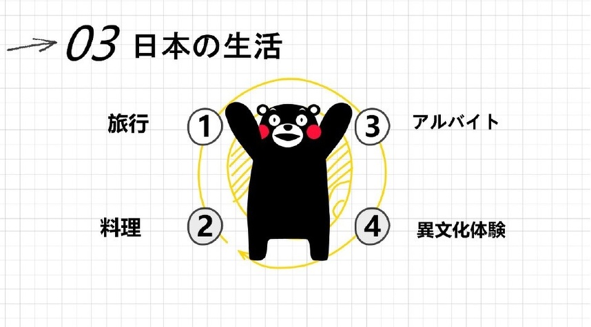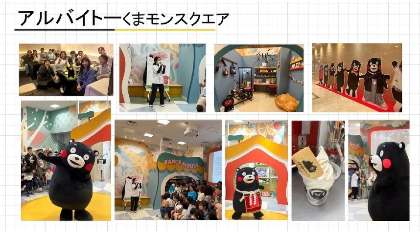 次はアルバイトについてです。私は去年の3月から、熊本の「くまモンスクエア」でアルバイトをしています。ここで、とても楽しいバイトの時間を過ごしています。