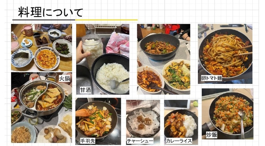実は、私日本に留学してから初めて一人暮らしを始めました。日本に来てからは、自分で料理をするようになって、最初の1年ぐらいはスマホで料理の動画を見ながら、なんとか作っていました。今では作れる料理もどんどん増えてきて、友達と一緒に火鍋を食べたり、チャーハンや麺を作ったりしています。