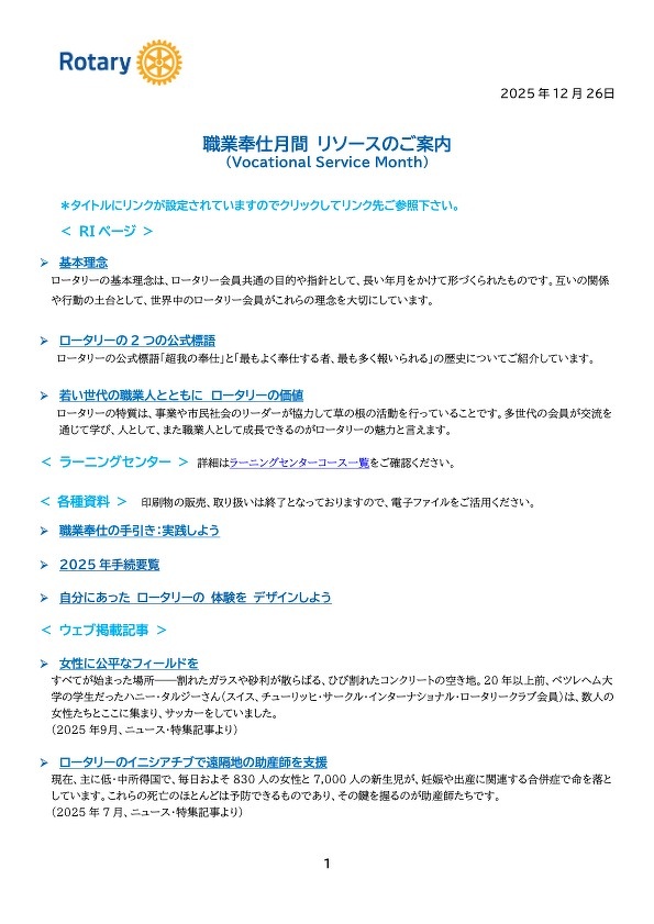 1月は職業奉仕月間。職業倫理の向上を目指すことは、すなわち人間力の向上に繋がり、One profits most who serves best (最も良く 奉仕する者最も多く報われる)や、THE 4-WAY TEST(4つのテスト)のようなロータリ ーの究極の目的と一致いたします。 改めて「職業奉仕」について、我々ひとり一人が考える月間にしてはいかがでしょうか。