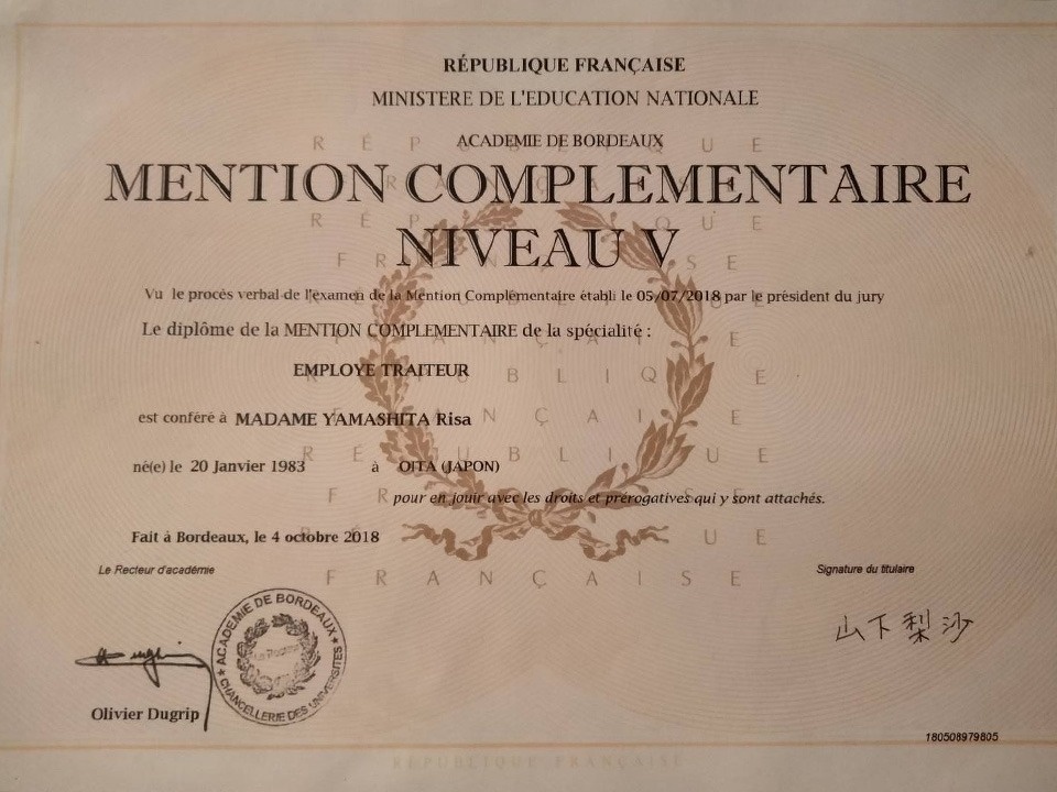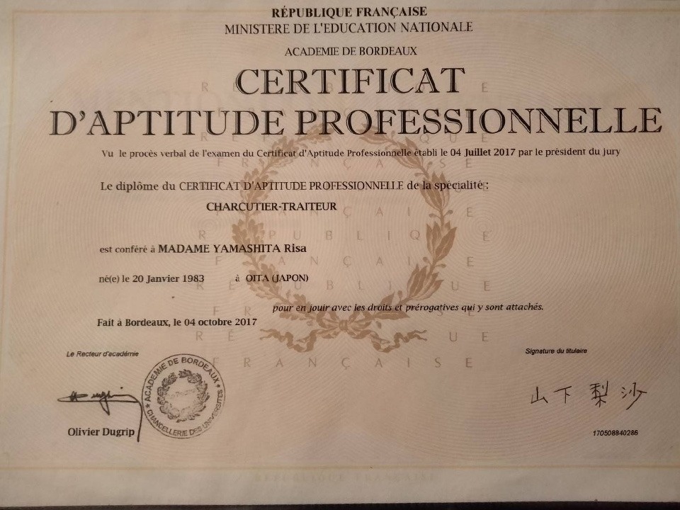 そんな仲間に支えられながら、2週間授業を受け、2週間現場で修業する規定のプログラムを2年間こなしたのち、国家試験を受けました。国家試験はフランス人なら一度失敗しても何度か挑戦することができますが、特例で専門学校に入学した私のチャンスはたった一度だけ。試験中は震えが止まりませんでしたが、猛勉強の甲斐あって、さまざまな職業の専門技術の基礎的なレベルを証明する「CAP(セーアーペー)」、さらに食肉加工専門職「シャルキュティエ」の国家試験に合格することができました。渡仏直後にお世話になったY子さんとそのご家族をはじめ、娘のように可愛がってくれた近所の「ボルドーのパパとママ」、ミョンジャとレア、専門学校の友人、先生方・・・もうダメかもしれない、というギリギリのところでいつも誰かに助けられて夢を叶えられたことに、感謝しかありません。