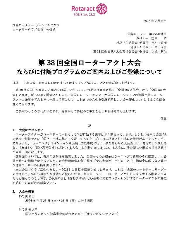 国際ロータリー第2750地区より「第38回全国ローターアクト大会」のご案内が届いています。