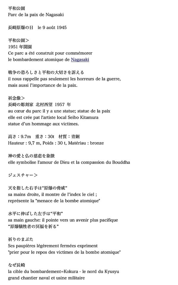 特に長崎では、原爆についてさまざまな質問がありました。なぜ長崎が標的になったのか、日本人はアメリカに対してどんな感情を持っているのか。8月9日、もともと標的だった小倉に焼夷弾の煙が立ち込め視界不良だったため、急遽第二目標の長崎に変更されたこと、被曝者が今日に渡るまで差別を受けていた現実など、おそらく平和学習で習ってはいたものの恥ずかしながら記憶から抜け落ちていたことを文献や現地ガイドから学び直し、伝えました。ちなみにほかに多かった質問は天皇(日本の象徴で政治的機能はもたない)、平均収入(最低賃金は時給1000円程度、フランスは倍の1900円程度)、社会保障制度(主に年金。フランスでは受給年齢を62歳から64歳に引き上げる改革が強行採択されたが、国民の大ブーイングで昨年末から頓挫中)、軽自動車(ヨーロッパにはない規格)などです。