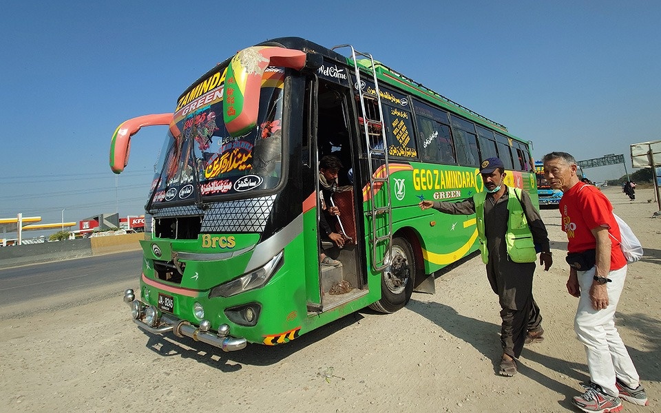 同じく2日目と3日目に、カラチ市内の高速道路のインターチェンジ手前で長距離バスを停め、車内に乗り込んで、乗車している5歳以下の子どもたちにワクチンを投与する活動も行いました。バスを停める際には、「レンジャー」と呼ばれる軍のメンバーが協力してくれます。バス内での投与をサポートしてくれたワーカーは男性でした。どのバスもほぼ満員で、大人が二人座る座席の間に、子どもが3人も4人もぎっしりと座っている光景を何度も目にしました。隙間に埋まっているような子どもを見つけ出してはワーカーが年齢を確認して保護者にワクチン投与の承諾をもらい、私たちが投与を行いました。