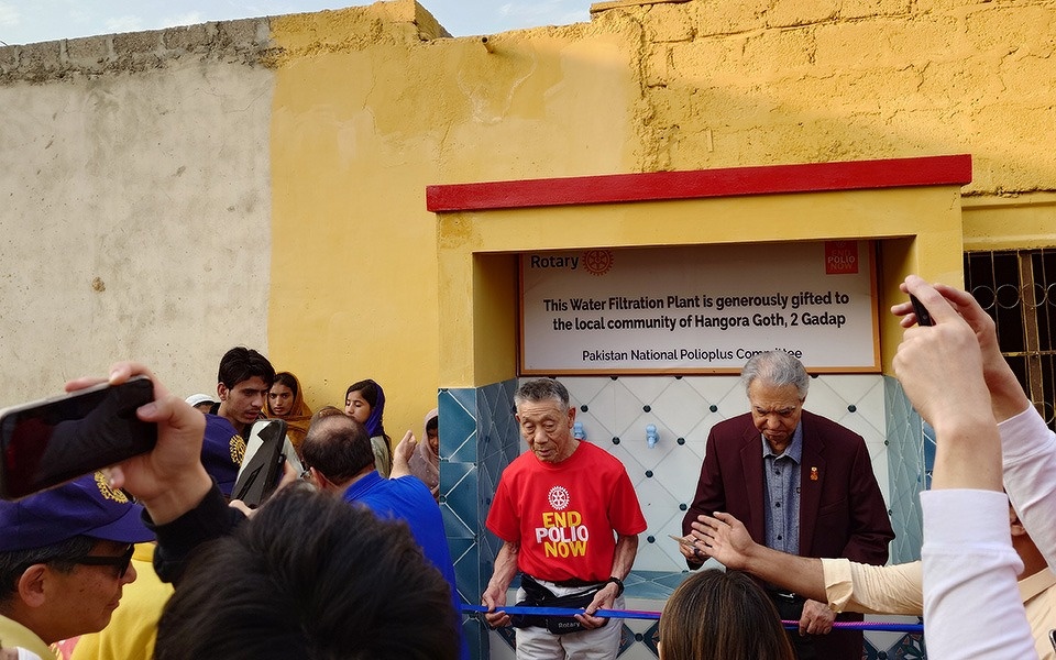 今回の活動では、ワクチン投与とともに、浄水設備(ウォータープラント)の寄贈にも立ち会いました。清潔な水がなければ、感染症は防げません。トイレや手洗いの習慣が十分でない地域では、ポリオの感染も広がりやすくなります。きれいな水を届けることは、医療と同じくらい重要な予防策です。活動の合間に今回のチームメイトが寄贈した2基のプラントを視察し、最後に故金正司氏(岐阜中RC)が寄贈したプラントの開通式に立ち合いました。式にはパキスタンのRI財団管理委員でパキスタンにおけるポリオ根絶を主導しているAziz Memon氏が駆けつけて下さいました。