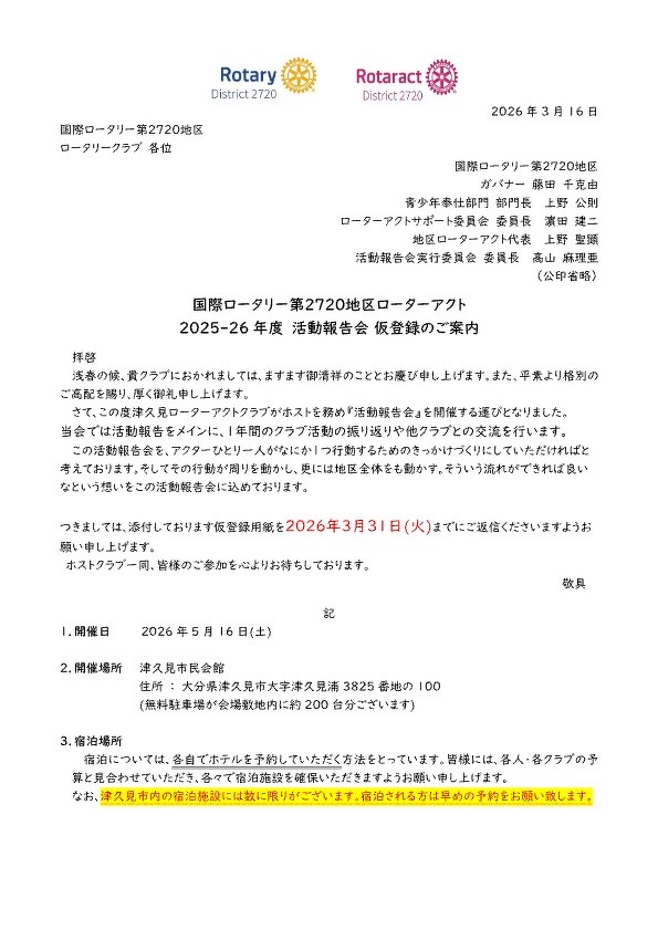 2720 Japan O.K. ロータリーEクラブ会員の方はこちらで出席へ