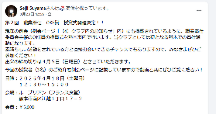 ↓ 職業奉仕プロジェクト委員会報告 https://ok2720eclub.jp/meeting/reikai260406.html#shokugyouhoushi