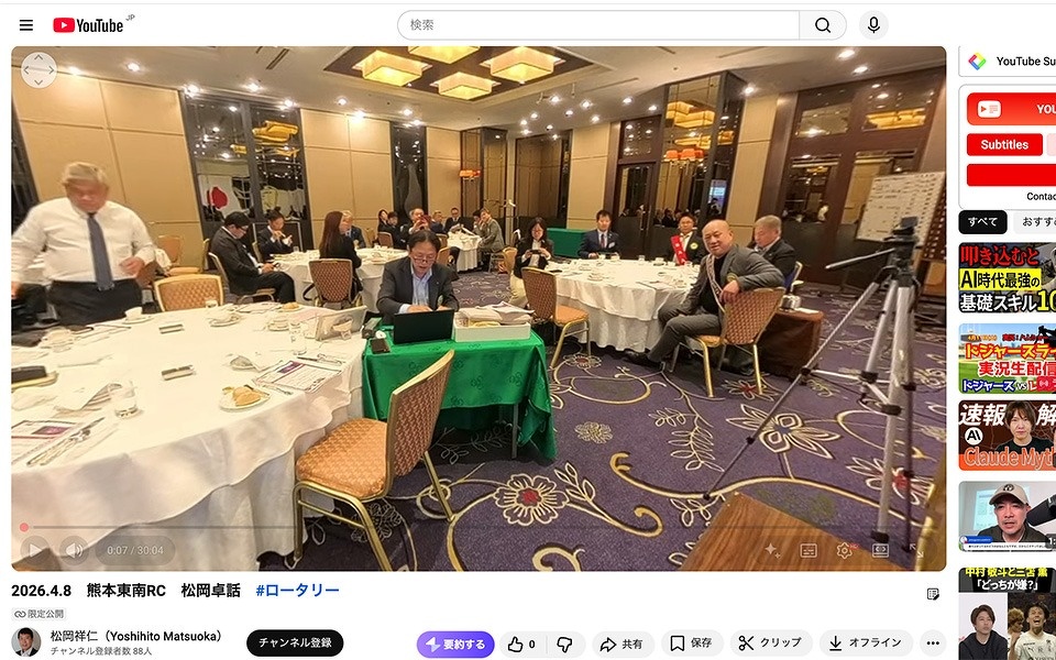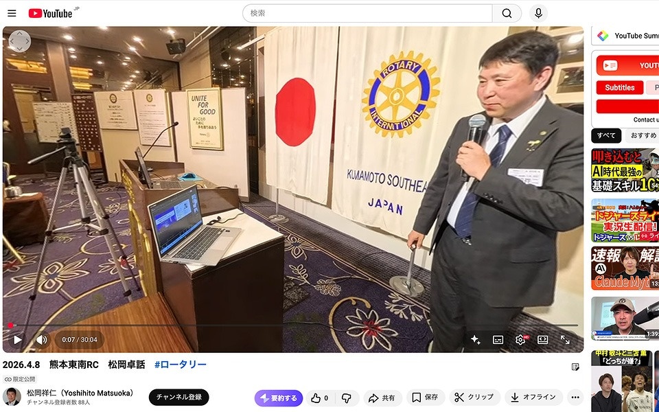 下記のYoutubeの卓話動画ですが、このWebページ内で見た場合、会場の画面がずっと映った形になってしまっておりますが、360度回転の動画で撮影しており、Youtubeのチャンネルでご覧になると画面のところでマウスを置くと動画画面が回転して、松岡会員がお話ししている画面になります。このページ内では同様のコントロールができないため、お手数をおかけします。スライドなどは権利の関係で提供できないため、申し訳ありませんがYoutubeのチャンネルにてご覧ください。